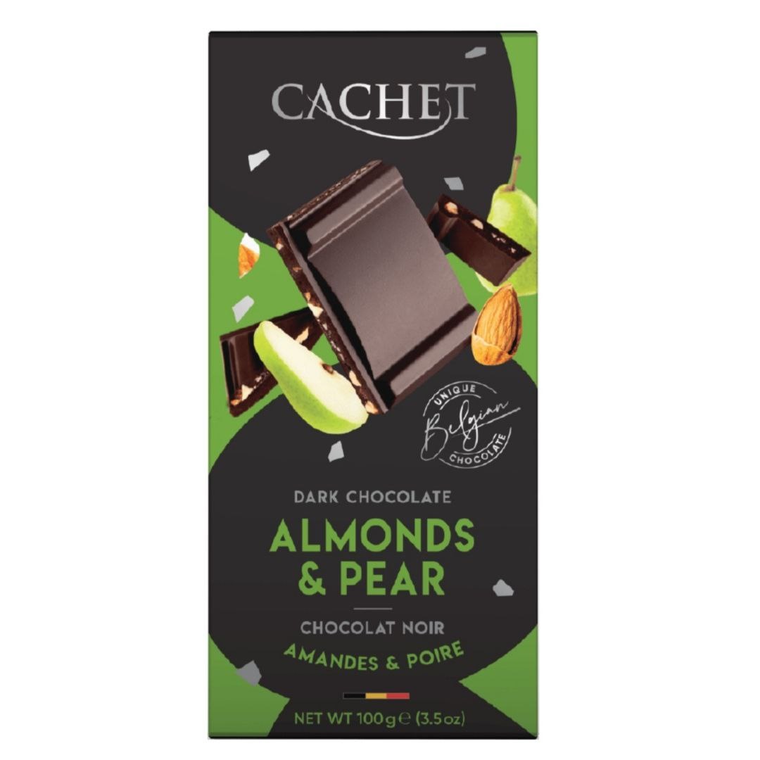 Cachet Dark Chocolate Almonds & Pear — преміальний бельгійський шоколад із вмістом какао 57 % що поєднує хрусткі шматочки мигдалю та ніжні грушеві відтінки. Це збалансоване поєднання гірко-солодкого шоколаду з наміром надати продукту текстуру та фруктову свіжість. Виготовлено в Бельгії тримовим стандартом якості.
