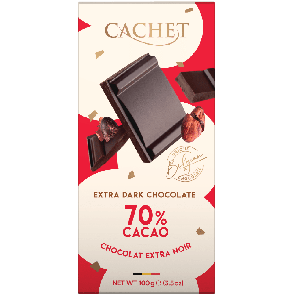 Cachet Extra Dark 70% Cacao — класичний бельгійський темний шоколад з високим вмістом какао. Має багатий глибокий смаковий профіль де переважають нотки темного какао та легка гірчинка. Відмінний варіант для поціновувачів чистого темного шоколаду або як інгредієнт до випічки. Продукт підходить для веганів