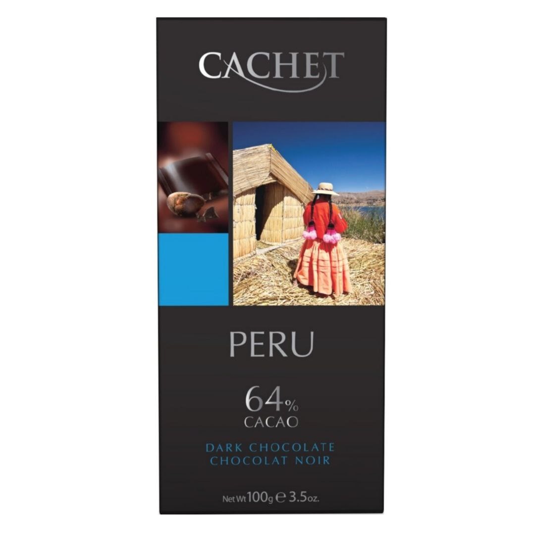 Cachet Peru 64% Dark Chocolate — преміальний шоколад із какао-бобів із Перу (single origin) що виготовляється в Бельгії. Має виразний фруктовий аромат тонкий букет сухофруктів і легку гірчинку яка збалансована кремовою солодкістю — що додає шоколаду унікальної гладкості. Це поєднання створює насичений запам’ятовуваний смак. Шоколад також підходить для веганів.