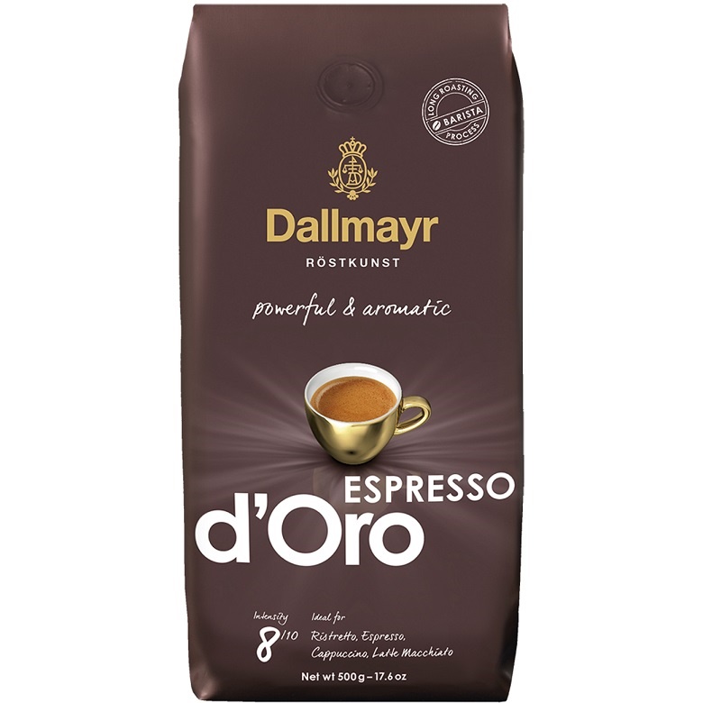 Dallmayr Espresso d’Oro — преміальна суміш високогірних зерен арабіки й робусти ретельно обсмажених довго і дбайливо. Результат — щільний ароматний кавовий напій з насиченим тілом щедрою crema й виразними шоколадно-какао тонами. Ідеальний для ristretto еспресо капучино та лате .
