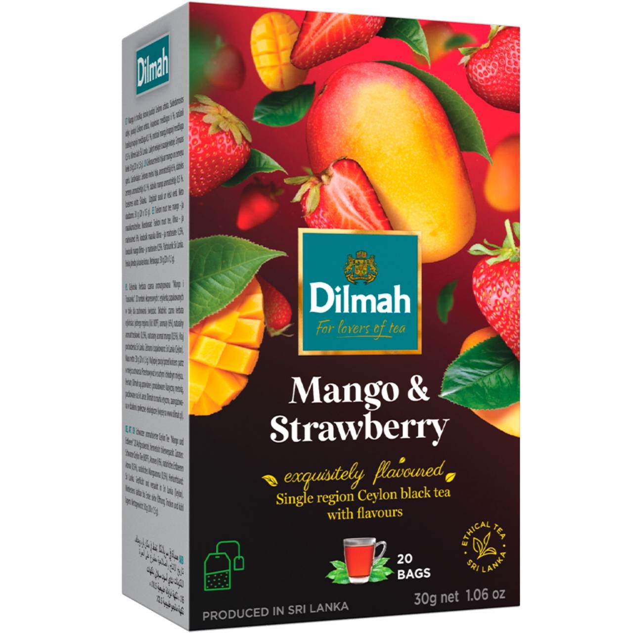 Dilmah Mango & Strawberry — це ароматизований чорний чай на основі добірного цейлонського листа. Поєднання тропічного манго та соковитої полуниці створює яскравий солодкий смак і приємний фруктовий аромат. Підходить для приготування як гарячих так і охолоджених напоїв.