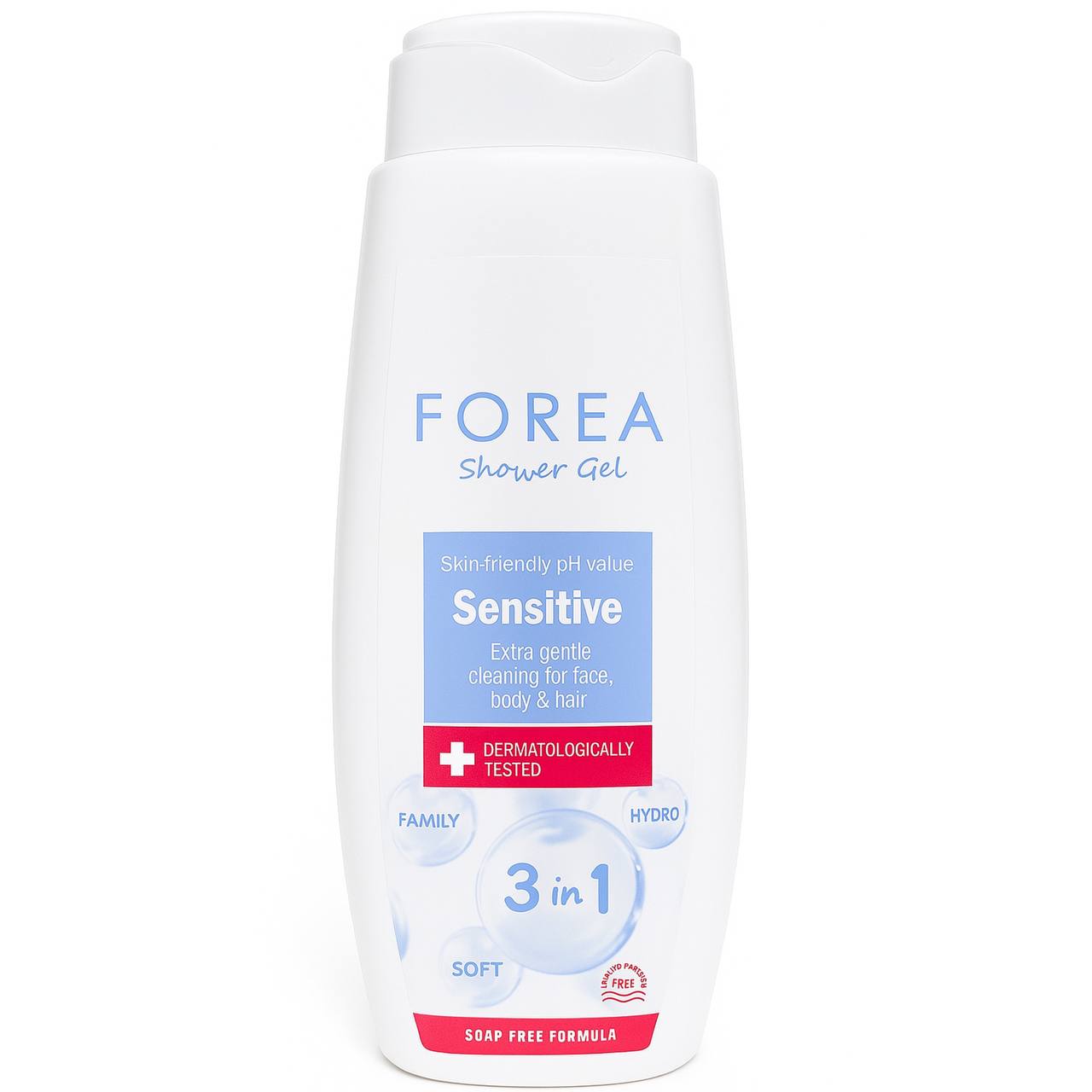 Forea 3 в 1 Sensitive — м’який гель для душу, який поєднує функції засобу для тіла, обличчя та волосся. Завдяки делікатній формулі без агресивних компонентів ідеально підходить для чутливої шкіри. Забезпечує ніжне очищення та комфорт під час щоденного використання.
