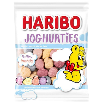 Haribo Joghurties — це поєднання жувальної гумі та ніжного йогуртового шару. Кожна цукерка має вершково-фруктову основу: полуниця вишня лимон малина персик-маракуя й чорниця. Верхній шар м’який і злегка пухнастий завдяки додаванню сухого йогуртового порошку знежиреного молока що створює освіжаючий йогуртовий післясмак . Ідеальні для поціновувачів класичної текстури з делікатною кислинкою.
