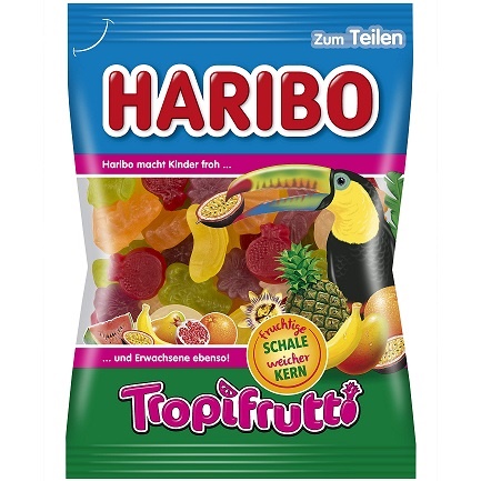 Haribo Tropifrutti — яскраві желейні фігурки у формі фруктів та екзотичних символів (тукан пальма маракуя тощо) з характерною твердуватою оболонкою та м’яким центром. Смаки включають ананас банан гранат манго-мандарин маракуя й диню створюючи атмосферу сонячних тропіків. Кожна упаковка вагою 175 г — це порція літа в кишені. Продукт виготовлено в Німеччині відзначається класичною текстурою та нестереотипною тропічною палітрою смаків.