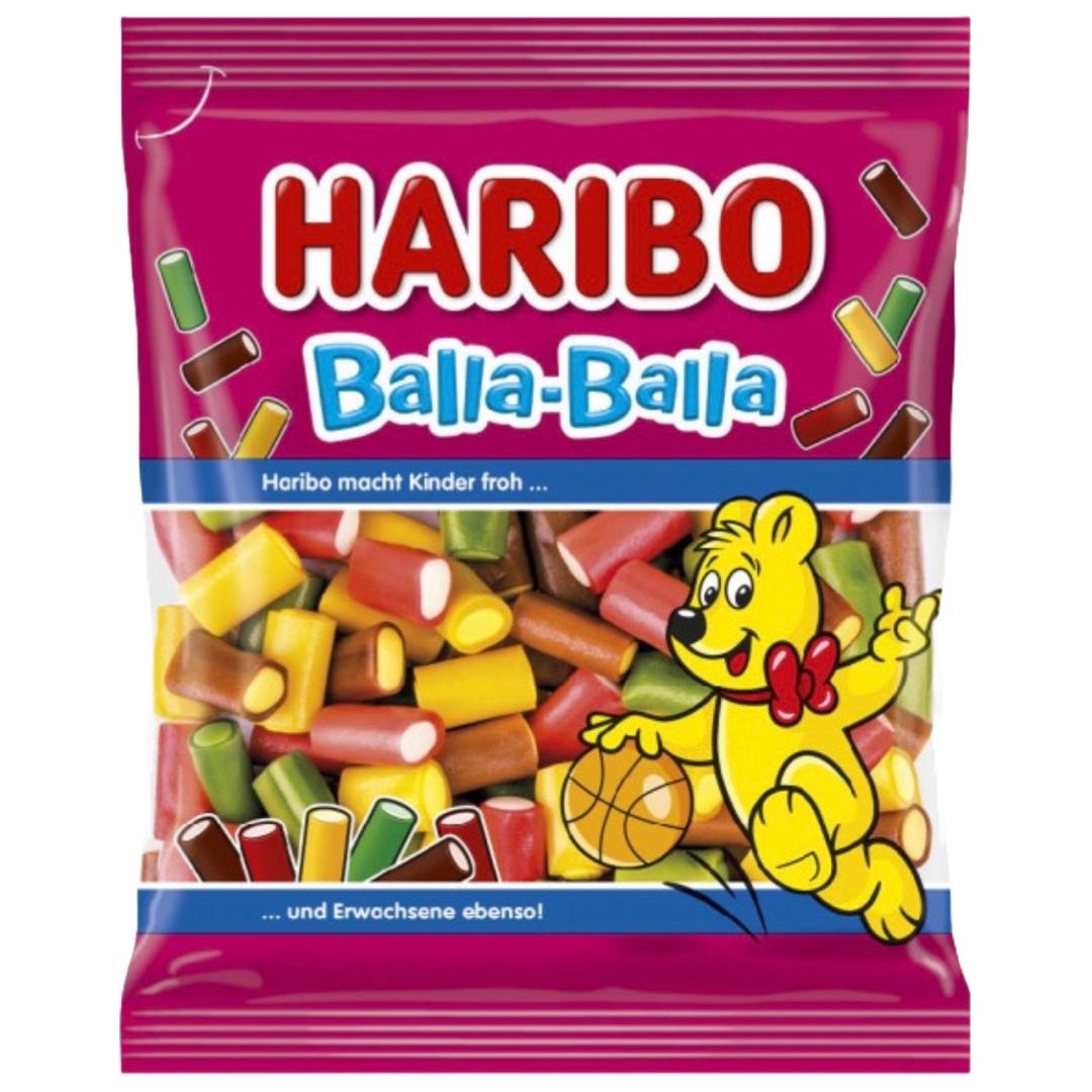 Haribo Balla‑Balla — яскраві желейні цукерки у вигляді рулонів із м’яким кремовим центром що поєднує смаки кола-апельсину полуничного крему яблука та лимону а також вишні чи малини залежно від версії. Виготовлено в Німеччині за традиційними рецептами Haribo з натуральними барвниками та ароматами.