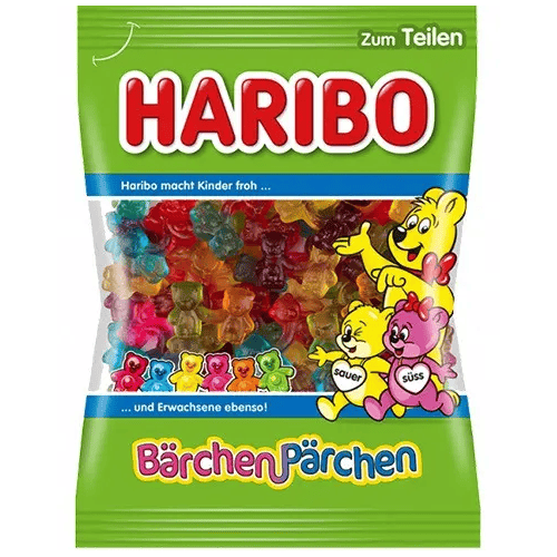 Haribo Bärchen Pärchen — жувальні желейні ведмеді поєднані «парами» з комбінованим смаком: кисло-чорниця + солодка малина кисло-лимон + солодка вишня кисло-апельсин + солодке яблуко. Кожна пара дарує баланс солодощі та кислотності створюючи веселий контраст смаків. Упаковка містить 160 г гуммі виготовлених у Німеччині з якісних натуральних барвників і класичного желатину. Гарантує автентичну текстуру Haribo — м’яку з легким жувальним опором.