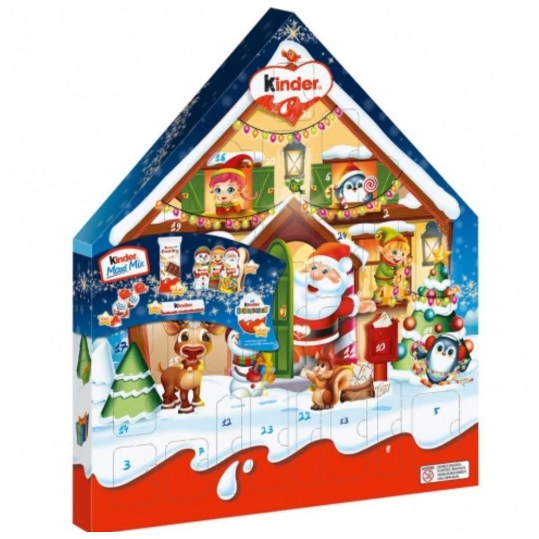 Kinder Адвент календар Будиночок Maxi Mix — це справжня новорічна казка у форматі великого тривимірного будиночка, який стане окрасою святкового інтер’єру. Усередині — 24 віконця, кожне з яких приховує смачні сюрпризи від Kinder: Kinder Bueno Mini, Kinder Schoko-Bons, Kinder Chocolate Mini, Kinder Country та інші шоколадні ласощі з фірмового молочного шоколаду з ніжною молочною начинкою.